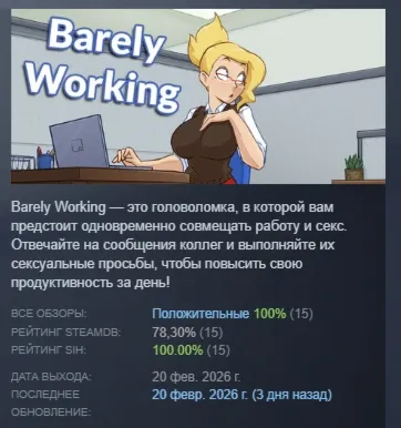 ДОСТАВКА ОСУЩЕСТВЛЯЕТСЯ В АВТОМАТИЧЕСКОМ РЕЖИМЕ ONLiNE 24/7 Barely Working — это головоломка, в которой вам предстоит одновременно совмещать работу и секс. Отвечайте на сообщения коллег и выполняйте их сексуальные просьбы, чтобы повысить свою продуктивность за день!